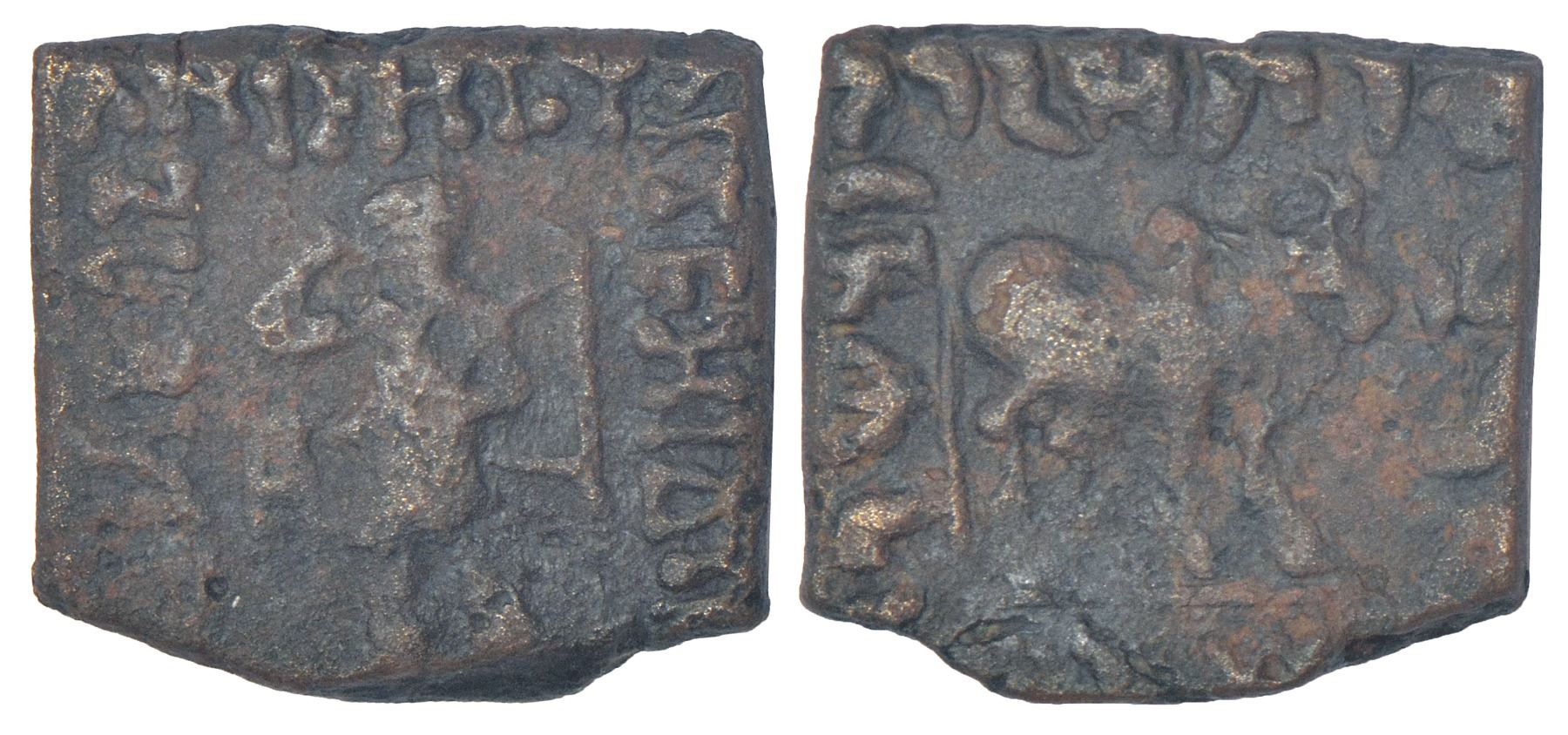 Indo-Greeks - copper unit of Artemidoros (c.100-80 BC), BN serie 7, 7.85g. Obv: Artemis standing facing, with bow slung over arm, drawing arrow from quiver; Greek legend BASILEOS ANIKETOU ARTEMIDO… on three sides. Rev: Humped bull walking right, traces of monogram below; Kharoshthi legend Maharajasa Apadihatasa Artimido(ra)… around.