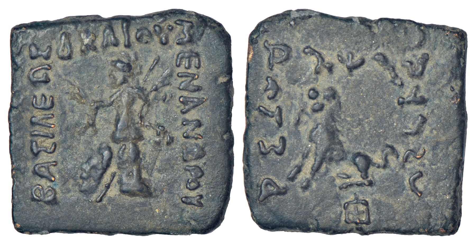 Indo-Greeks - copper unit of Menander II Dikaios (c.90-80 BC), BN serie 5, 7.53g. Obv: Athena standing left, raising right hand, holding spear and palm frond, shield at side; Greek legend BASILEOS DIKAIOU MENANDROU. Rev: Lion seated facing left; monogram below; Kharoshthi legend Maharajasa Dhramikasa Menandrasa around.