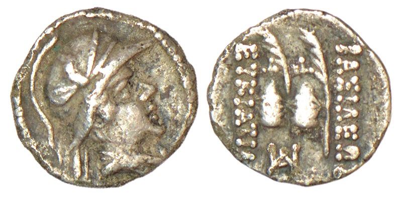 Ancient India: Indo-Greeks, silver obol of Eucratides (170-145 BC), BN series 9, 0.55g. Obv: Helmeted bust of the king. Rev: Two 'pilloi’ caps and Greek legend BASILEOS EUKRATIDOU on either sides.