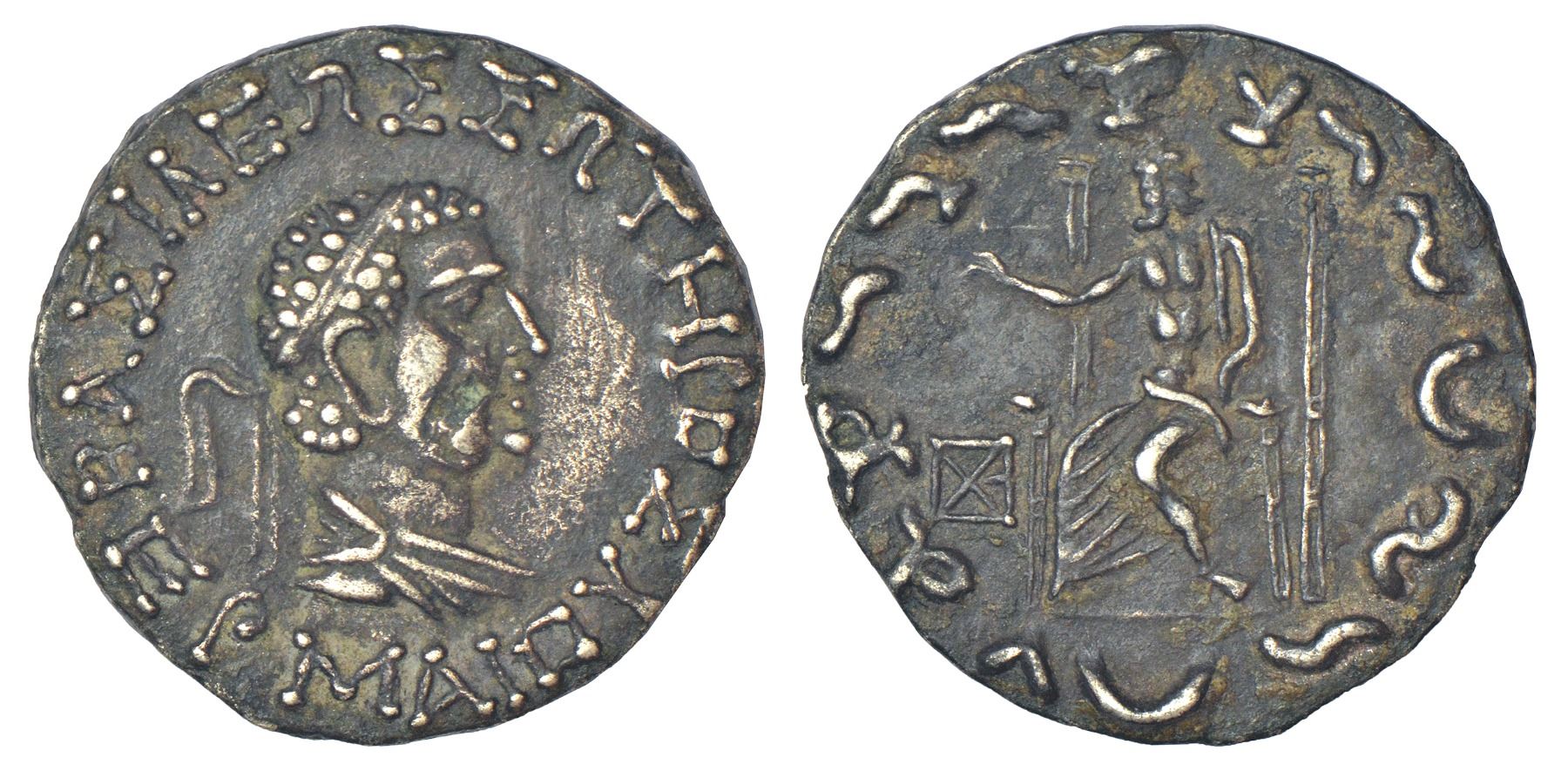 Indo-Greeks - silver tetradrachm of Hermaios (c.105-90 BC), BN group III serie 14, 9.52g. Obv: Diademed and draped bust facing right; Greek legend around BASILEOS SOTEROS ERMAIOU. Rev: Zeus Mithra seated holding sceptre, making a benediction gesture with his right hand, monogram in left field; Kharoshthi legend Maharajasa Tratarasa Heramayasa around.