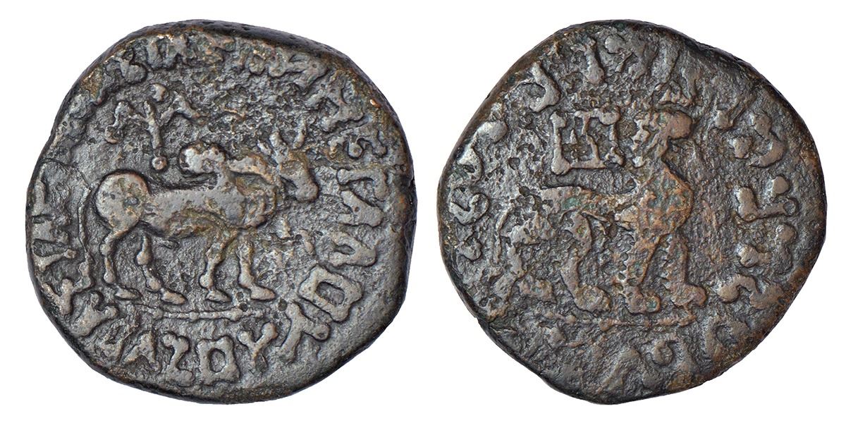 Ancient India: Indo-Scythians, copper coin of Azes (c.58-12 BC), Senior ISCH 102.174, 13.37g. Obv: Bull walking to right, monogram above; Greek legend BASILEOS BASILEON MEGALOU AZOU around. Rev: Lion standing facing right, monogram above; Kharoshthi legend Maharajasa Rajadirajasa Mahatasa Ayasa around.