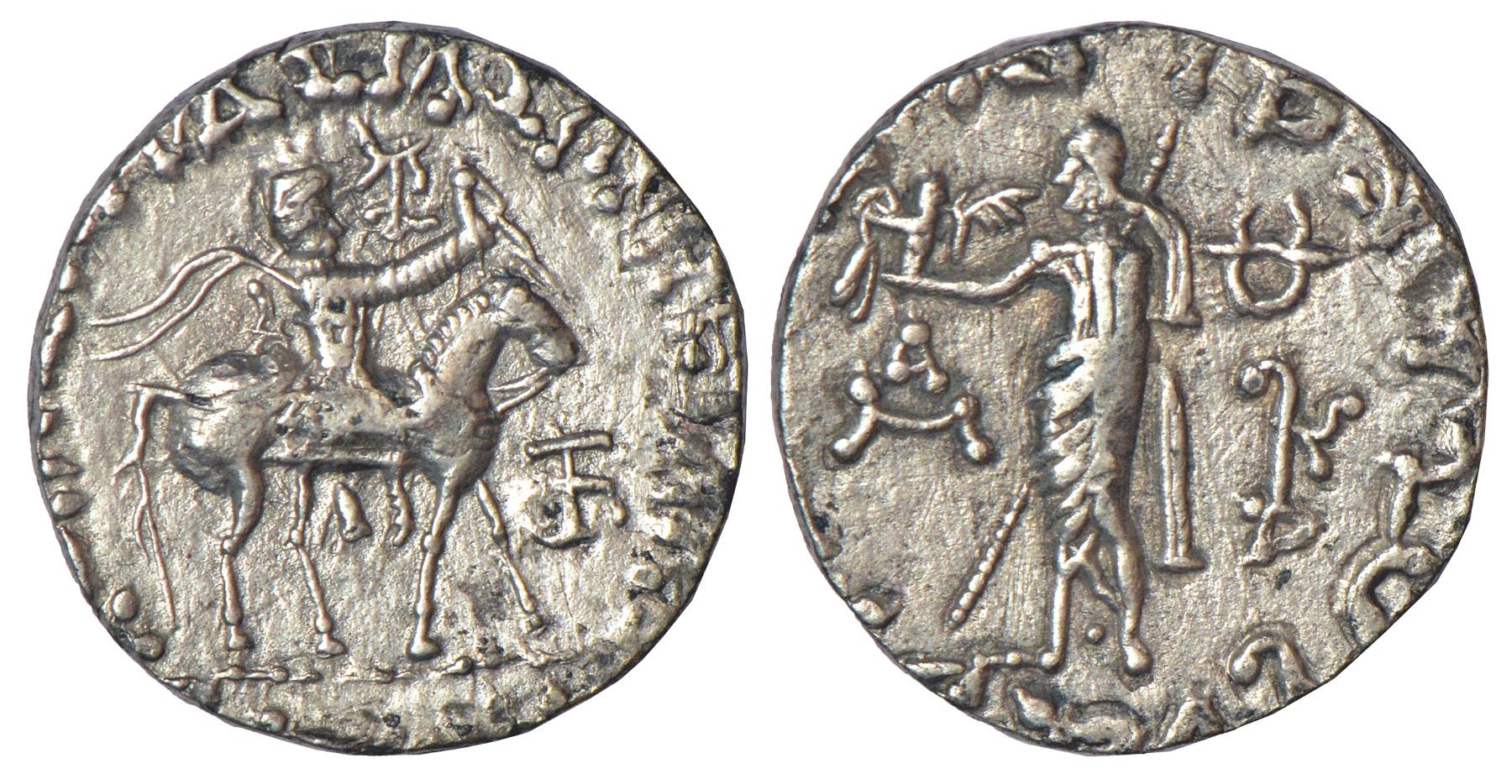 Indo-Scythians - silver tetradrachm of Azes (c.45-12 BC), ISCH 105.462T, 8.95g. Obv: King on horseback facing right, holding whip, composite Kharoshthi monogram in front of the head, composite Kharoshthi monogram to the right; Greek legend BASILEOS BASILEON MEGALOU AZOU partly visible around. Rev: Diademed Zeus Nikephotos standing facing left holding standard; composite Kharoshthi monogram and Nandipada to right, Greek monogram to left, Kharoshthi legend Maharajasa Rajarajasa Mahatasa Ayasa visible in parts.