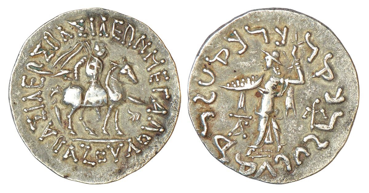 Ancient India: Indo-Scythians, silver tetradrachm of Azes (c.58-12 BC), ISCH 90.51T, 10.18g. Obv: King on horseback to right, holding spear, Kharoshthi letter Ga to right; Greek legend BASILEOS BASILEON MEGALOU AZOU around. Rev: Athena advancing left, holding shield on left arm and brandishing thunderbolt with her right hand, monograms to left and right; Kharoshthi legend Maharajasa Rajarajasa Mahatasa Ayasa around.