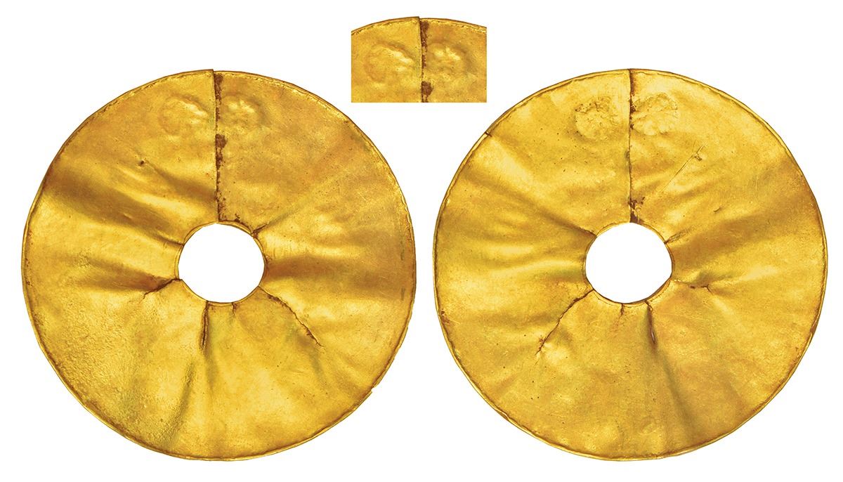 Ancient India: Indus Valley Civilization (mature phase, 2500-2000 BC), gold ornamental diskette, two wheel like symbol bevelled on obverse of diskette, to be strung into a necklace; 4.05g; 34.93mm.