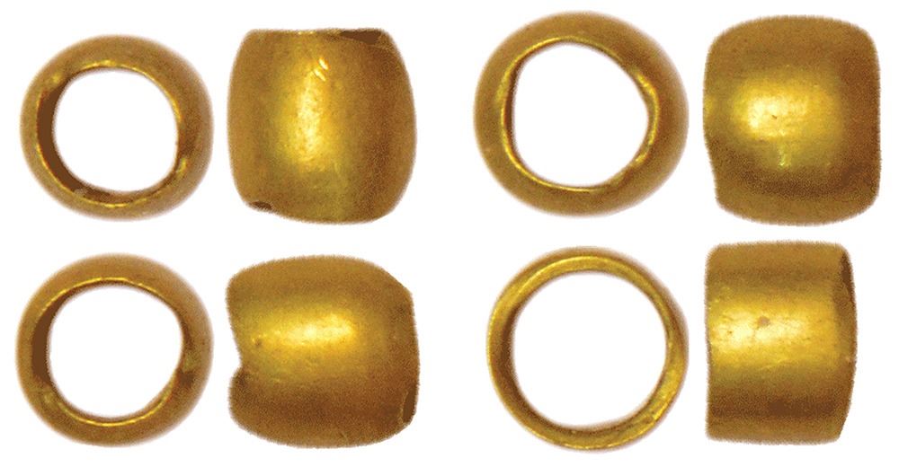 Indus Valley Civilization (mature phase, 2500-2000 BC), group of 4 gold hollow beads, to be strung into a necklace and 'possibly used for trade as primitive money, said to have been recovered from excavations at Harappan sites, weighs 0.06g, 0.07g, 0.08g and 0.09g; 2.40mm to 2.75mm. (4 beads)