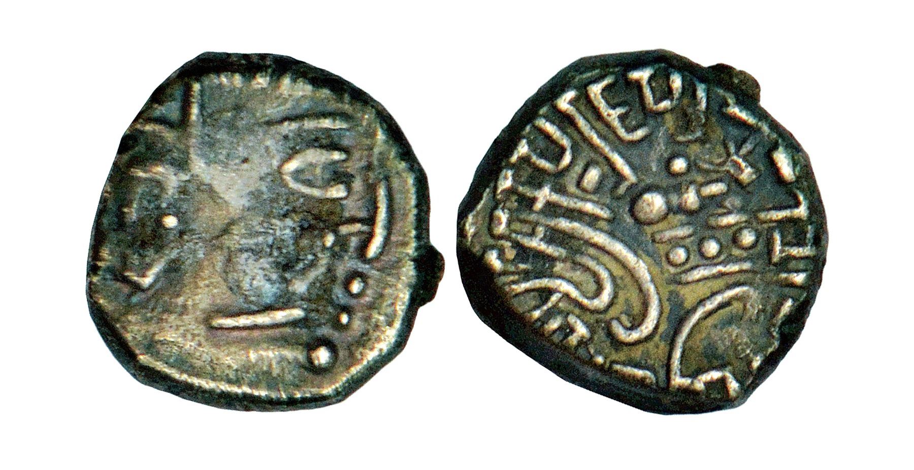 Kausambi/Vatsa region, uninscribed cast copper coin, 'lanky bull' type, 3.37g. Obv: 'Lanky bull' walking to left, triangle-headed standard in front, Nandyavarta symbol above. Rev: Tree-in-railing in centre, Nandipada and wheel to left, traces of 'Ujjain' symbol and swastika to right and a six-arched hill below. Pieper 976.