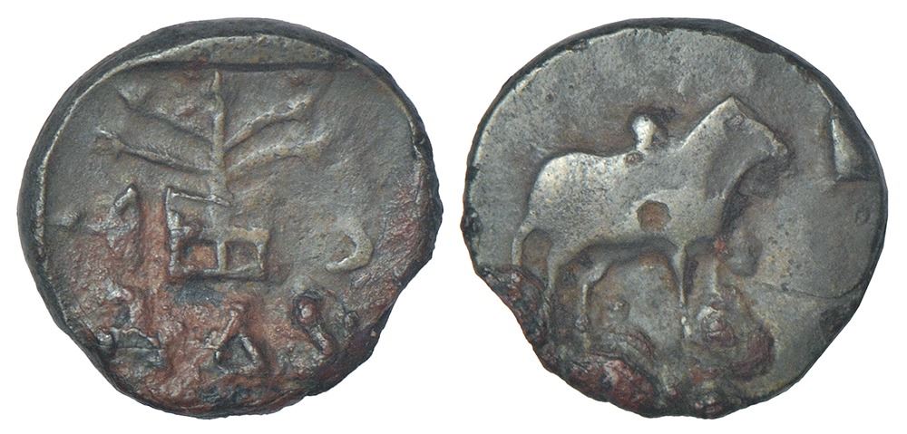 Kaushambi (Vatsa) - monarchical coinage attributed to pre-Kushana period, (c.50-100 AD), alloyed copper coin of Shiva(dasa/mitra?), not listed in PAIC, 2.25g. Obv: Strung bow and arrow, tree-in-railing and a sacrificial post in a row; Brahmi legend Shiva(da/mi?)… below. Rev: Bull standing facing right.
