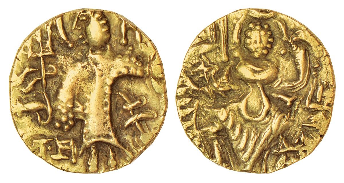 Ancient India: Kidarite Huns, base gold stater/dinara of Shri Vishwama (c.400-450 AD), unpublished in major sources, 7.91g. Obv: Kushana style king standing, holding a standard and offering sacrifice, a trident with ribbons in the background; Brahmi legend Kidara inscribed vertically under the arm and letter Sha to left. Rev: Stylized representation of seated Ardoksho holding cornucopia, Brahmi legend Shri Vishwama to right.