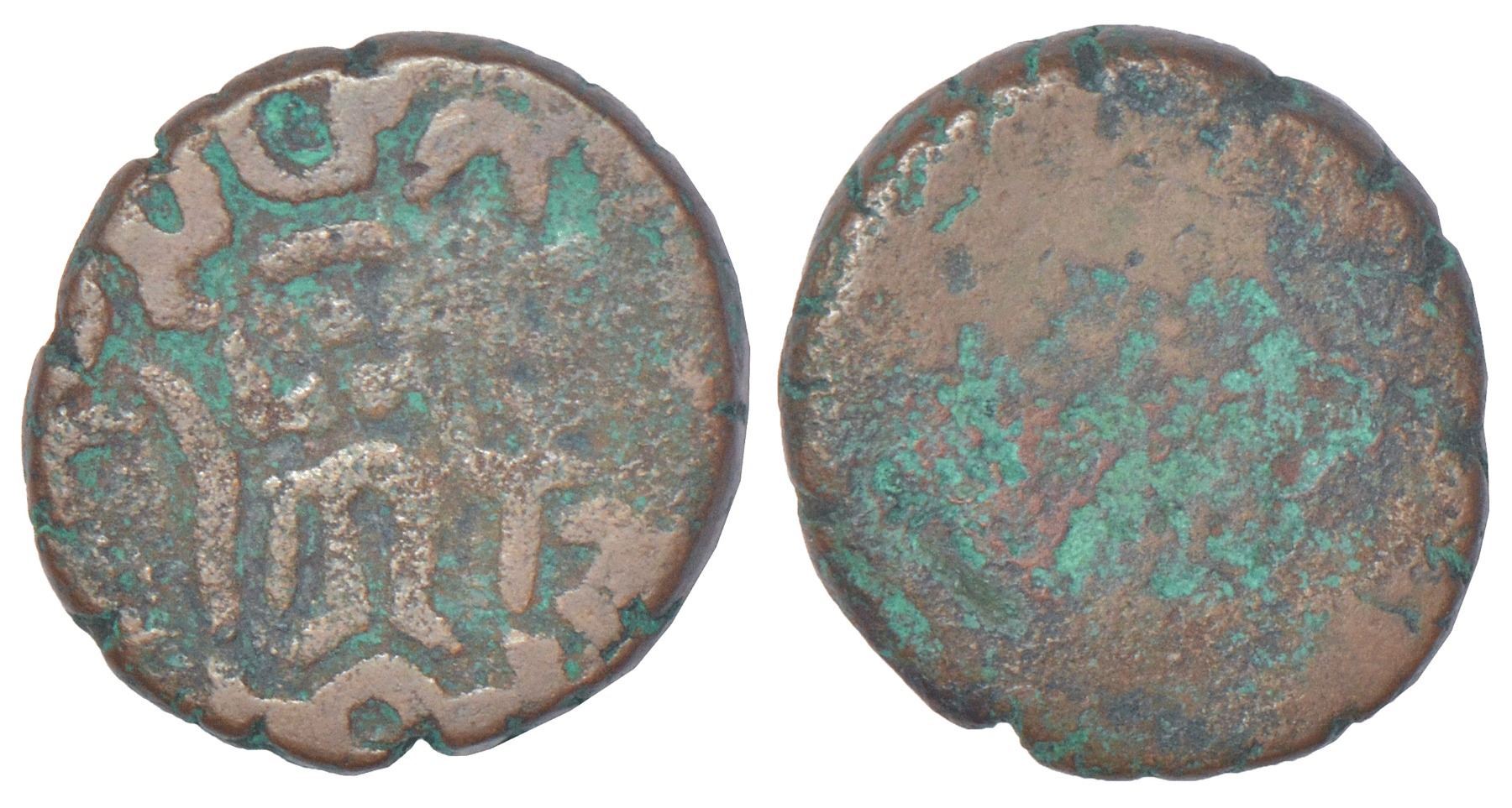 Kshatrapas of Mathura - copper unit of Hagamasha (c.10-20AD), PAIC 1286, 5.15g. Obv: Goddess standing on a stylized pedestal, tree to right and a curved line to left; Brahmi legend …pasa Ha(gamsha)sa around. Rev: Plain.