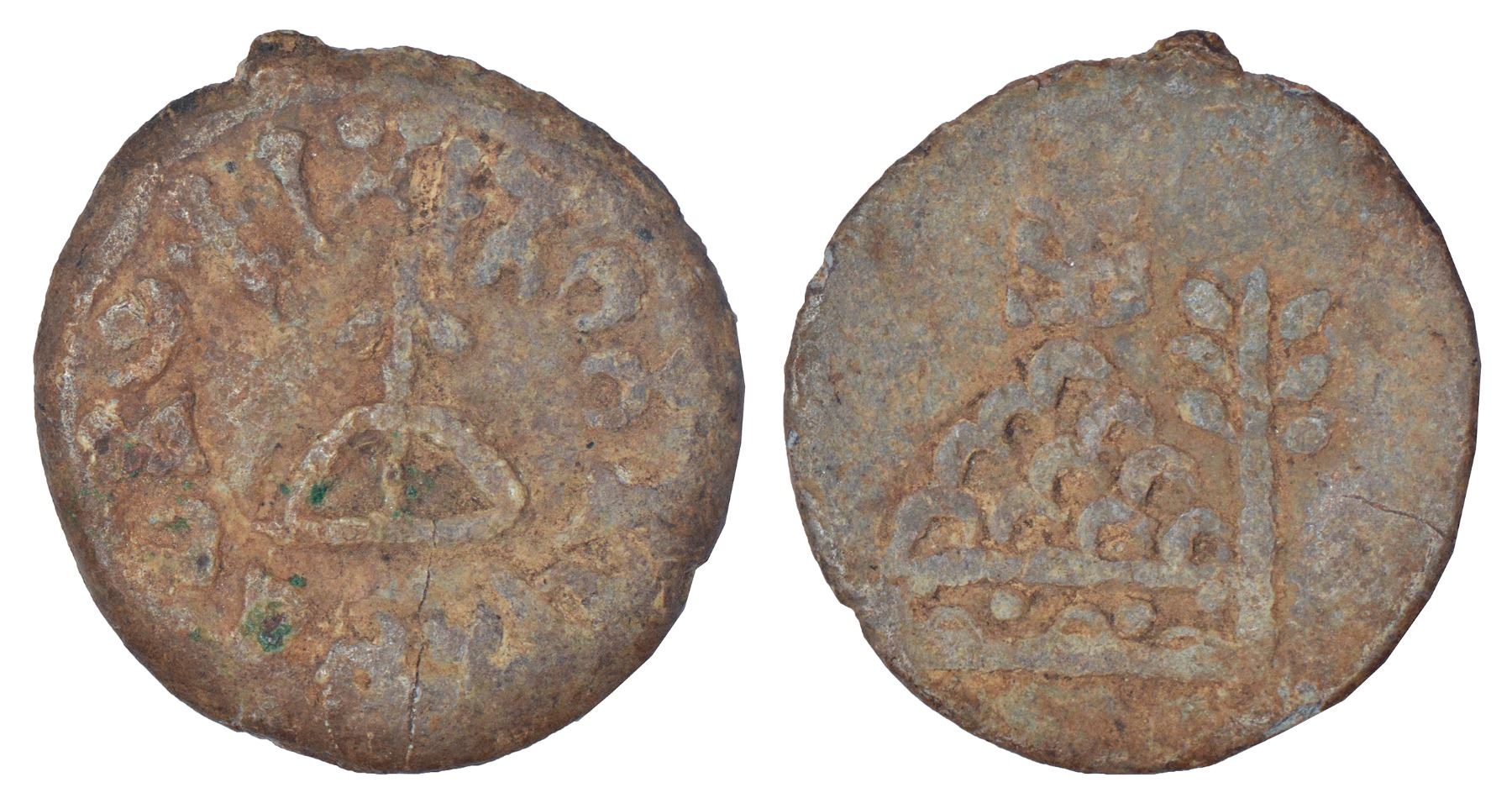 Kuras of South Maharashtra/North Karnataka - lead unit of Gotamiputa Vilivayakura (c.50-100 AD), PAIC 2043, 12.69g. Obv: Strung bow and arrow in center; Brahmi legend Raño Gotamiputasa Vilivayakurasa around. Rev: Ten-arched hill surmounted by crescent on a box enclosing a wavy line and dots with a tree emanating out of it to right.