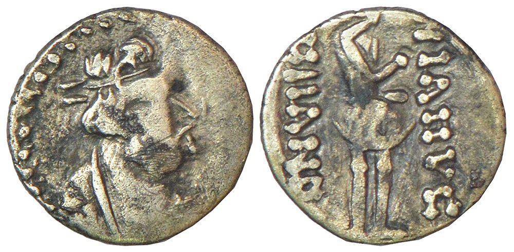 Kushana Empire - silver obol of Kujula Kadphises, (c.30/50-80 AD), 'Heraus' type struck in the Transoxiana/Bactria region, PAIC 1702, 0.54g. Obv: Diademed head of Kujula Kadphises to right; around, pelleted border. Rev: King standing front, head to right, wearing nomadic dress, holding sword in his left and raising his right hand; Bactrian legend HIAOY KOPhPhANOY on either side.