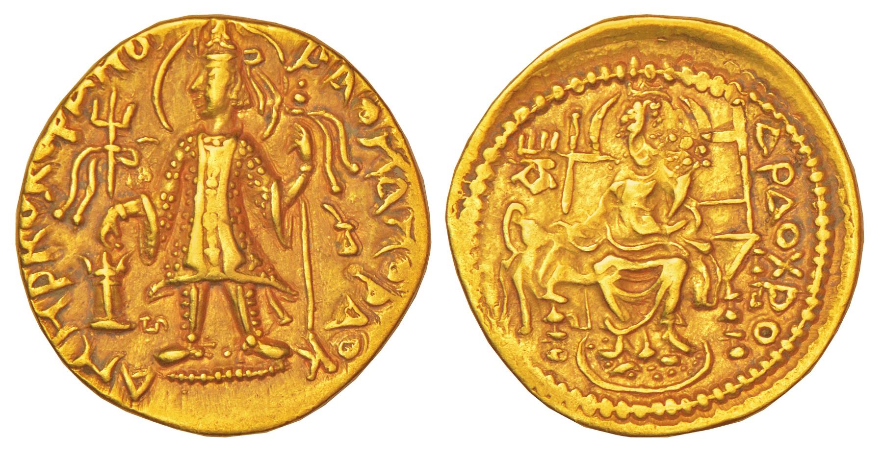 Kushans, gold dinar of Kanishka II (c.225-245 AD), Goebl 541, 7.86g. Obv: Nimbate king, wearing conical helmet, tunic,trousers and boots standing holding a standard with pennants, offering sacrifice at an altar, with a trident - battle-axe standard attached with ribbons in the background; Bactrian legend ShAONANO ShAO KONEShKO KOShANO around, Brahmi letter Ve to the right of the standard held by the king, and H near the base of the altar. Rev: Nimbate goddess, seated on highbacked throne with her feet on a footrest, carrying cornucopia in one hand and a diadem in the other; Bactrian legend ARDOKhShO to right and a Tamgha in the left field.