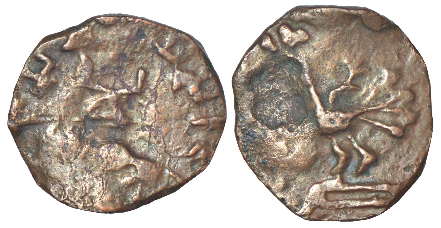 Magha kings of Mallar, Chhattisgarh - copper coin of Sivamagha Siri, (c.100-150AD), not listed in PAIC, 3.93g. Obv: Elephant facing left with typical 'angular M' symbol associated with Mallar above; Brahmi legend …ño Siva Magha Sirisa in exergue. Rev: Peacock in profile to left standing on a double-lined pedestal.
