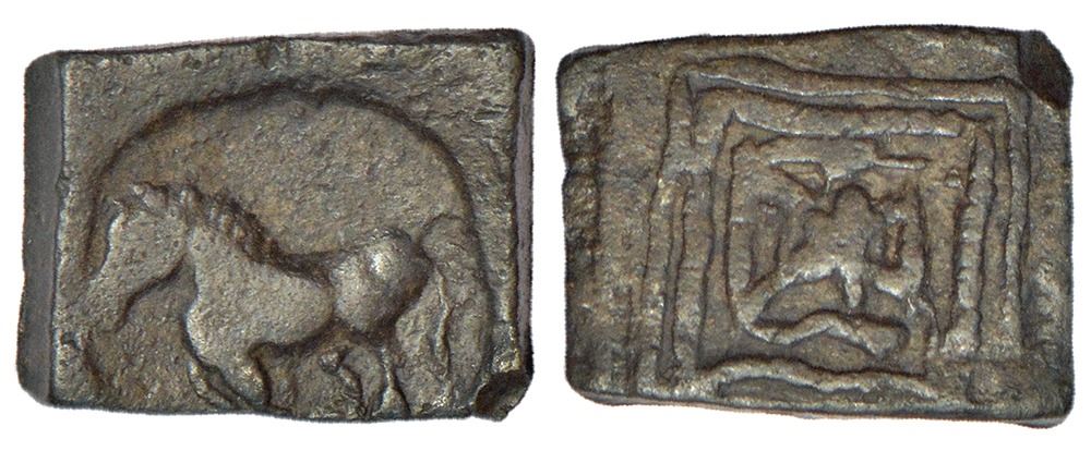 Mahatalavaras, Telangana/ Andhra region - uninscribed 'horse' type copper coin, (c.250-300 AD), unpublished in major sources, 1.56g. Obv: horse standing on a pedestal, facing left. Rev: sacred 'Bhadrapitha' symbol in a double rectangular border.