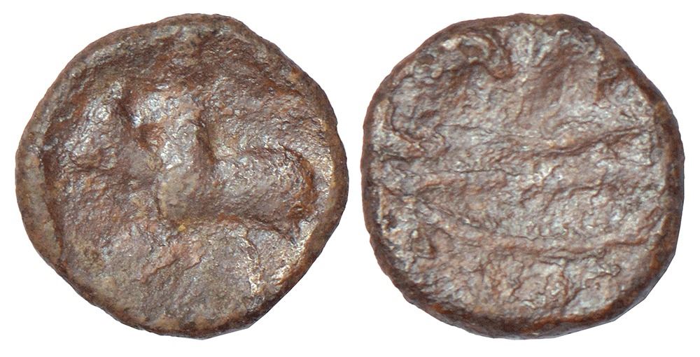 Mahatalavaras in South Andhra - uninscribed 'bull' type lead coin, (c.250-300 AD), unpublished in major sources, 1.72g. Obv: bull standing facing left.Rev: traces of an arched hill symbol within a double rectangular border.