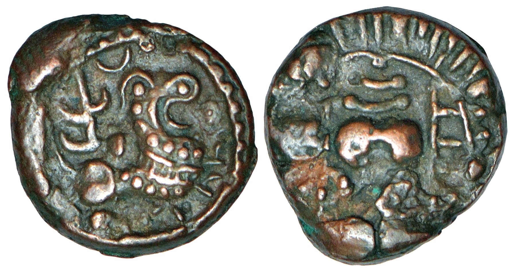 Post-Mauryan monarchical coinage of North India, Ayodhya (Saketa) series, cast copper coin of Sivadatta (150-100 BC), 1.93g. Obv: Bull walking to left & brahmi legend Sivadatasa above. Rev: Goddess Gajalakshmi standing facing holding long-stemmed lotuses in her hands. BMCAI p. 133-34, nos. 27-32.