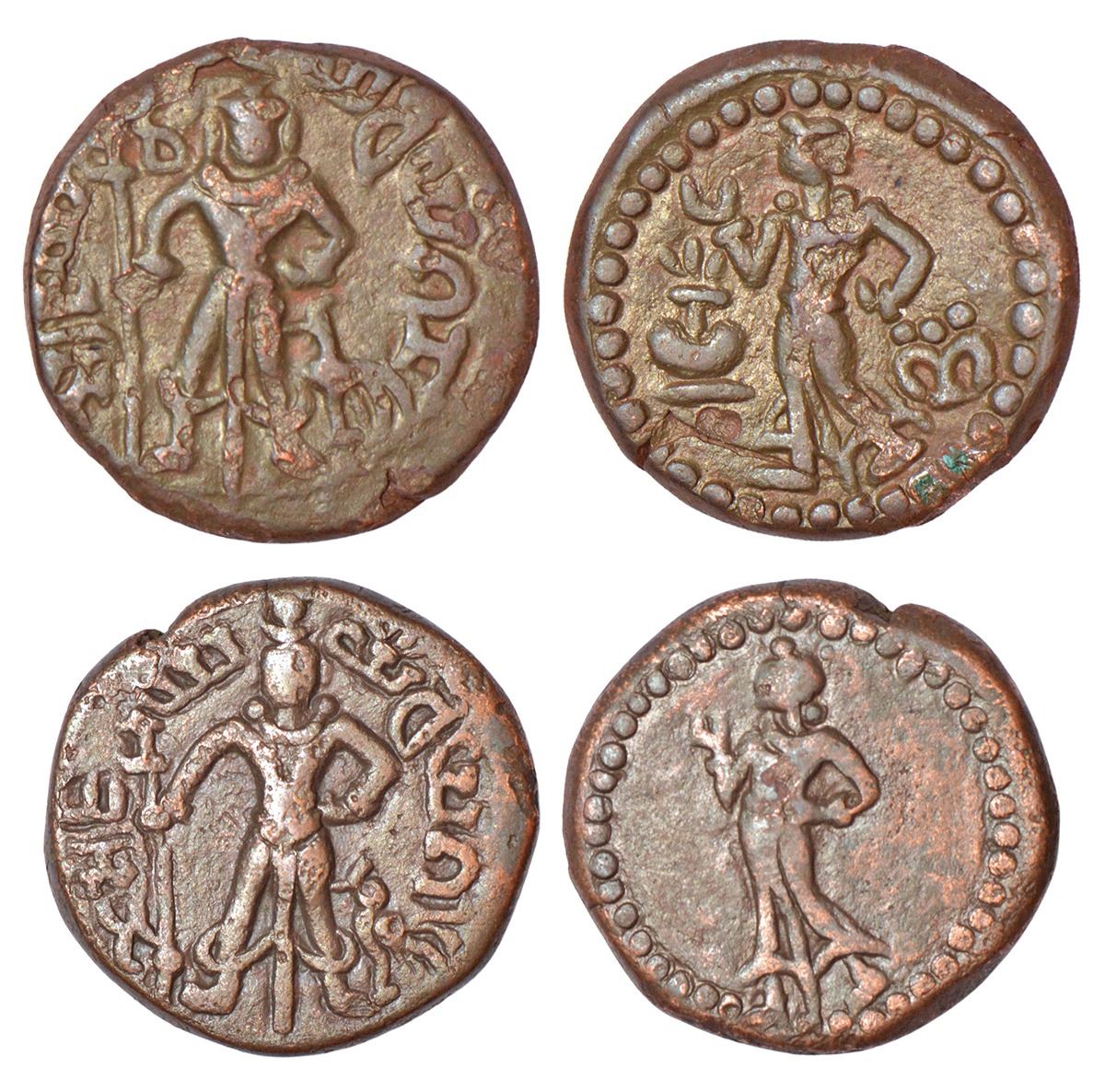 Ancient India: Post-Mauryan 'Tribal' Republics of North India - republic of the Yaudheyas, Punjab-Haryana region, two copper coins of Karttikeya type: (a) Pieper 1128, 11.19g. Obv: Karttikeya standing facing holding spear, cockerel at bottom right; Brahmi legend Yaudheya Gana / sya Jaya Dvi around. Rev: goddess Shashthi / Devasena walking to left; Kalasha (vase) on the left and inverted Nandipada to right and (b) Pieper 1129, 10.96g. Obv: Karttikeya standing facing holding spear, cockerel at bottom right; Brahmi legend Yaudheya Gana / sya Jaya around. Rev: goddess Shashthi / Devasena walking to left. (2 coins)