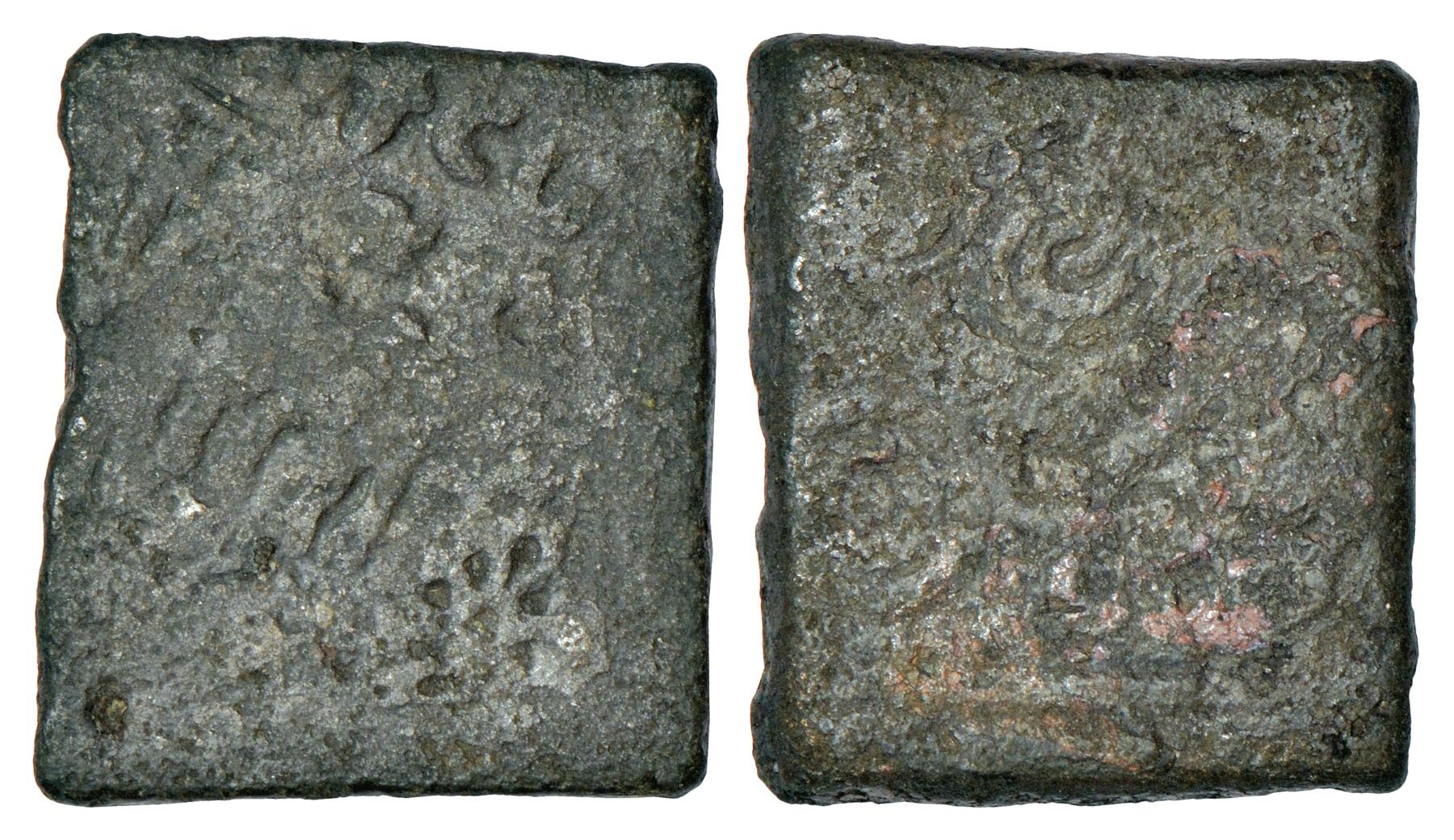 Post-Mauryan Vidarbha-Marathwada, copper coin of Kutapada (c.150-100 BC), not published in major sources, 12.49g. Obv: Bull standing to right, Swastika above its back, triangle-headed standard behind, six-arched hill in the front, traces of wavy line below; Brahmi legend …ño Kutapa… above. Rev: Faint traces of Nandipada drawn with double lines, Swastika above.