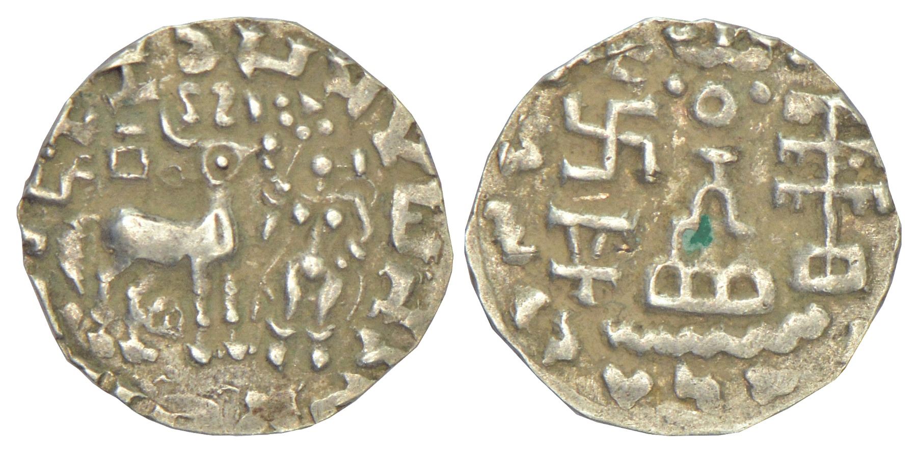 Post-Mauryan tribal monarchies, Kunindas - silver drachm of Amoghabhuti (c.50BC-50AD), PAIC 1198, 2.06g. Obv: Goddess holding lotus standing on a lotus, a deer to her left, Shrivatsa between horns and altar above rump, three arched hill below deer; Brahmi legend Rajño Kunindasa Amoghabhutisa Maharajasa visible in parts. Rev: Composite symbol of six-arched hill, wavy line, Nandipada, Swastika, triangle-headed standard-Shrivatsa and tree-in-railing; traces of Kharoshthi legend around.