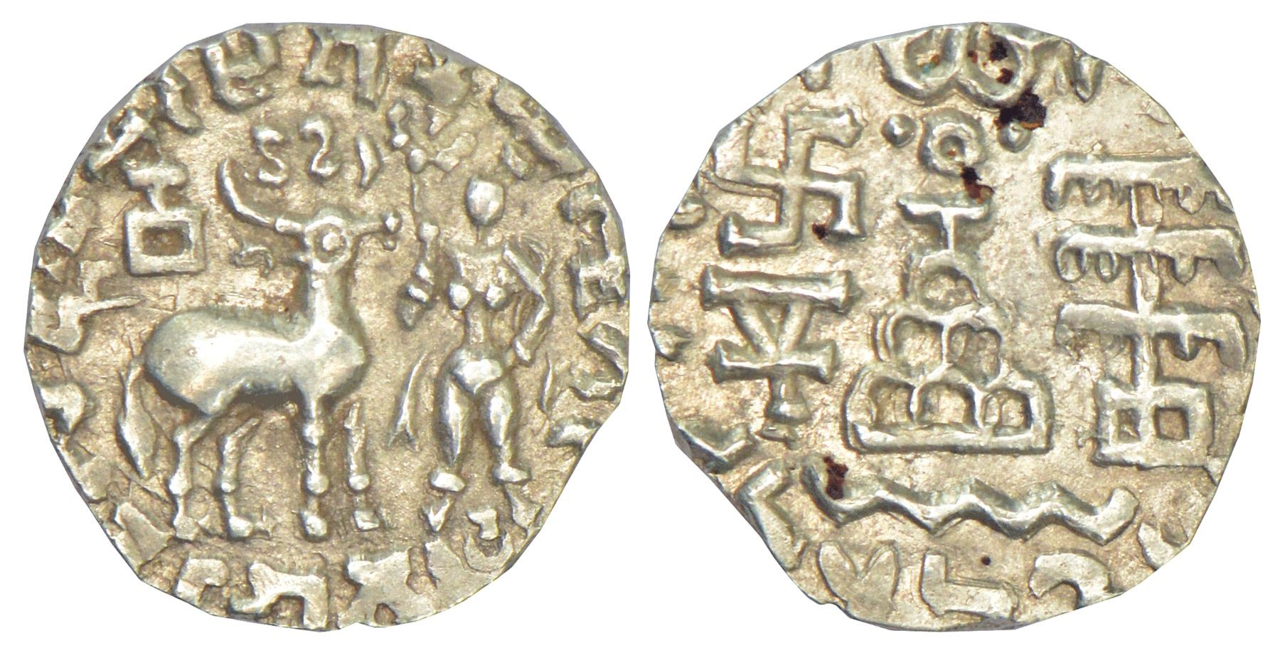 Post-Mauryan tribal monarchies, Kunindas - silver drachm of Amoghabhuti (c.50BC-50AD), PAIC 1212, 2.15g. Obv: Goddess holding lotus standing on a lotus, a deer to her left, Shrivatsa between horns and altar above rump; Brahmi legend Rajño Kunindasa Amoghabhutisa Maharajasa visible in parts. Rev: Composite symbol of six-arched hill, wavy line, Nandipada, Swastika, triangle-headed standard-Shrivatsa and tree-in-railing; traces of Kharoshthi legend around.