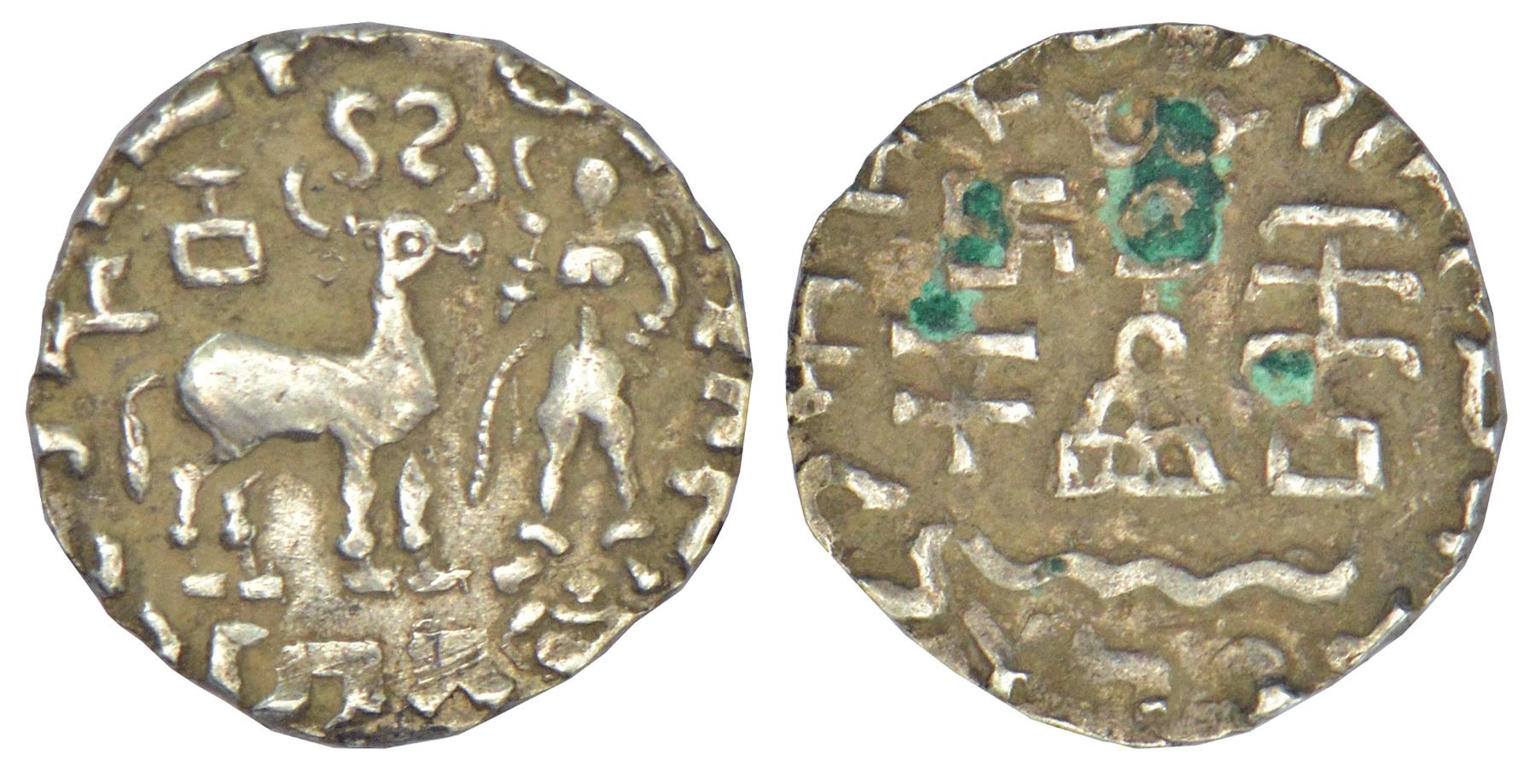 Post-Mauryan tribal monarchies, Kunindas - silver drachm of Amoghabhuti (c.50BC-50AD), PAIC 1212 var., 2.20g. Obv: Goddess holding lotus standing on a lotus, a deer to her left, Shrivatsa between horns and altar above rump; Brahmi legend Rajño Kunindasa Amoghabhutisa Maharajasa visible in parts. Rev: Composite symbol of six-arched hill, wavy line, Nandipada, Swastika, triangle-headed standard-Shrivatsa and tree-in-railing; traces of Kharoshthi legend around.