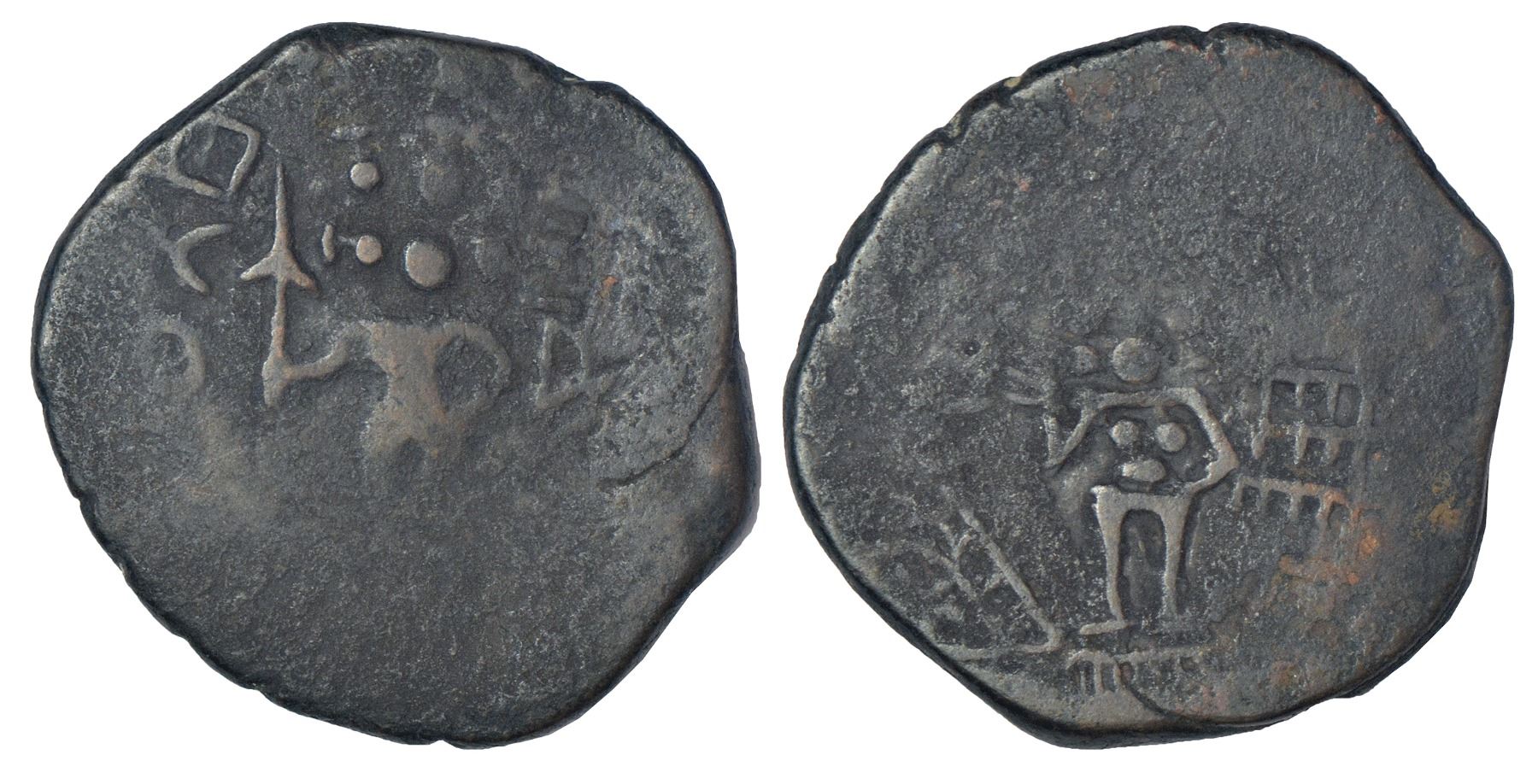 Post-Mauryan tribal republics, Yaudheyas, copper coin struck in the name of 'Brahmanya Deva' as tutelary deity of the clan (c.50 BC-50 AD), PAIC 1614 var., 8.15g. Obv: Six-headed Karttikeya standing facing holding a javelin, with hand on hip, partly visible; traces of Brahmi legend (Bha)gavato… to left. Rev: Six-headed goddess standing facing, tree-in-railing to right and ten-arched hill to left.