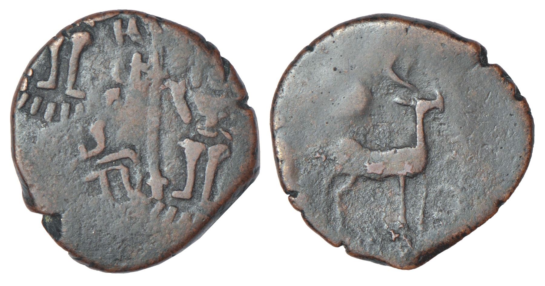 Post-Mauryan tribal republics - Yaudheyas, copper coin struck in the name of 'Brahmanya Deva' as tutelary deity of the clan (c.50 BC-50 AD), PAIC 1624., 7.16g. Obv: Six-headed Karttikeya standing facing holding a javelin, with hand on hip, traces of Brahmi legend to left. Rev: Deer facing right, Kalasha above.