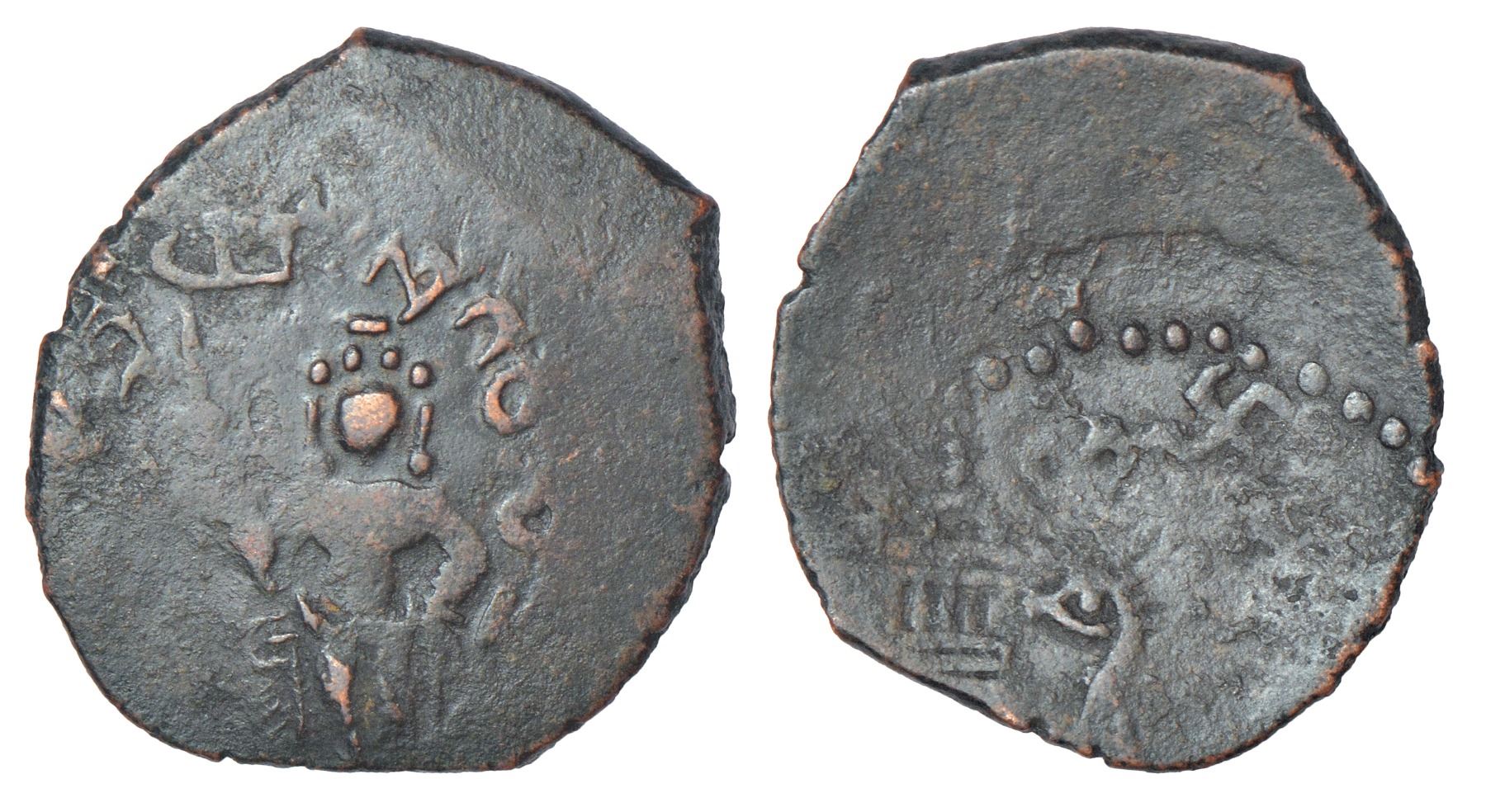 Post-Mauryan tribal republics - Yaudheyas, copper coin struck in the name of 'Brahmanya Deva' as tutelary deity of the clan (c.50 BC-50 AD), PAIC 1631, 4.98g. Obv: Single-headed Karttikeya standing facing holding a javelin, with hand on hip; traces of Brahmi legend Bhagavato… to right. Rev: Deer facing left, Swastika above its back and a temple to left.
