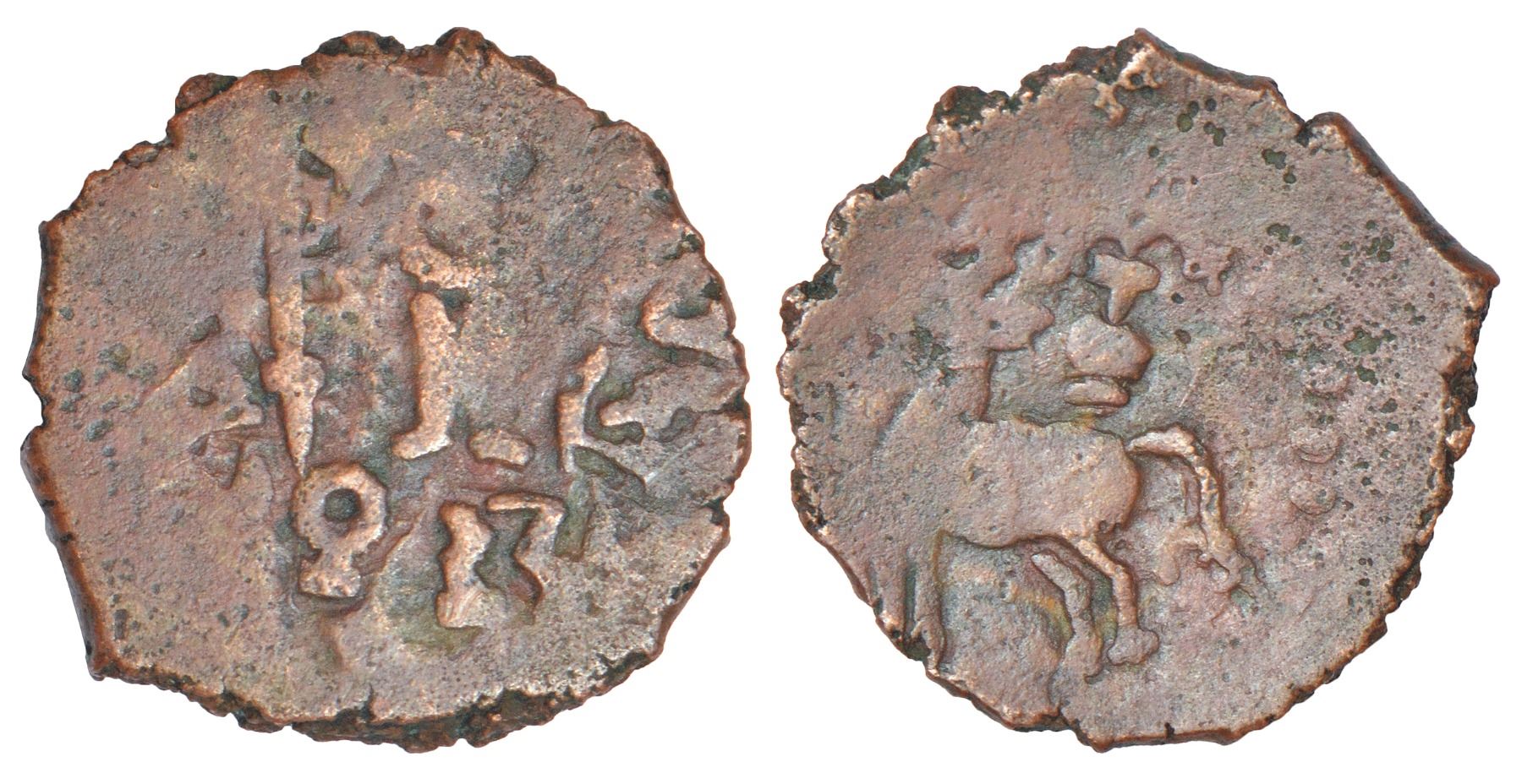Post-Mauryan tribal republics - Yaudheyas, copper coin struck in the name of 'Brahmanya Deva' as tutelary deity of the clan (c.50 BC-50 AD), PAIC 1633, 3.83g. Obv: Single-headed Karttikeya standing facing holding a javelin, with hand on hip, partly visible; traces of Brahmi legend below. Rev: Deer facing left, Kalasha above its back.