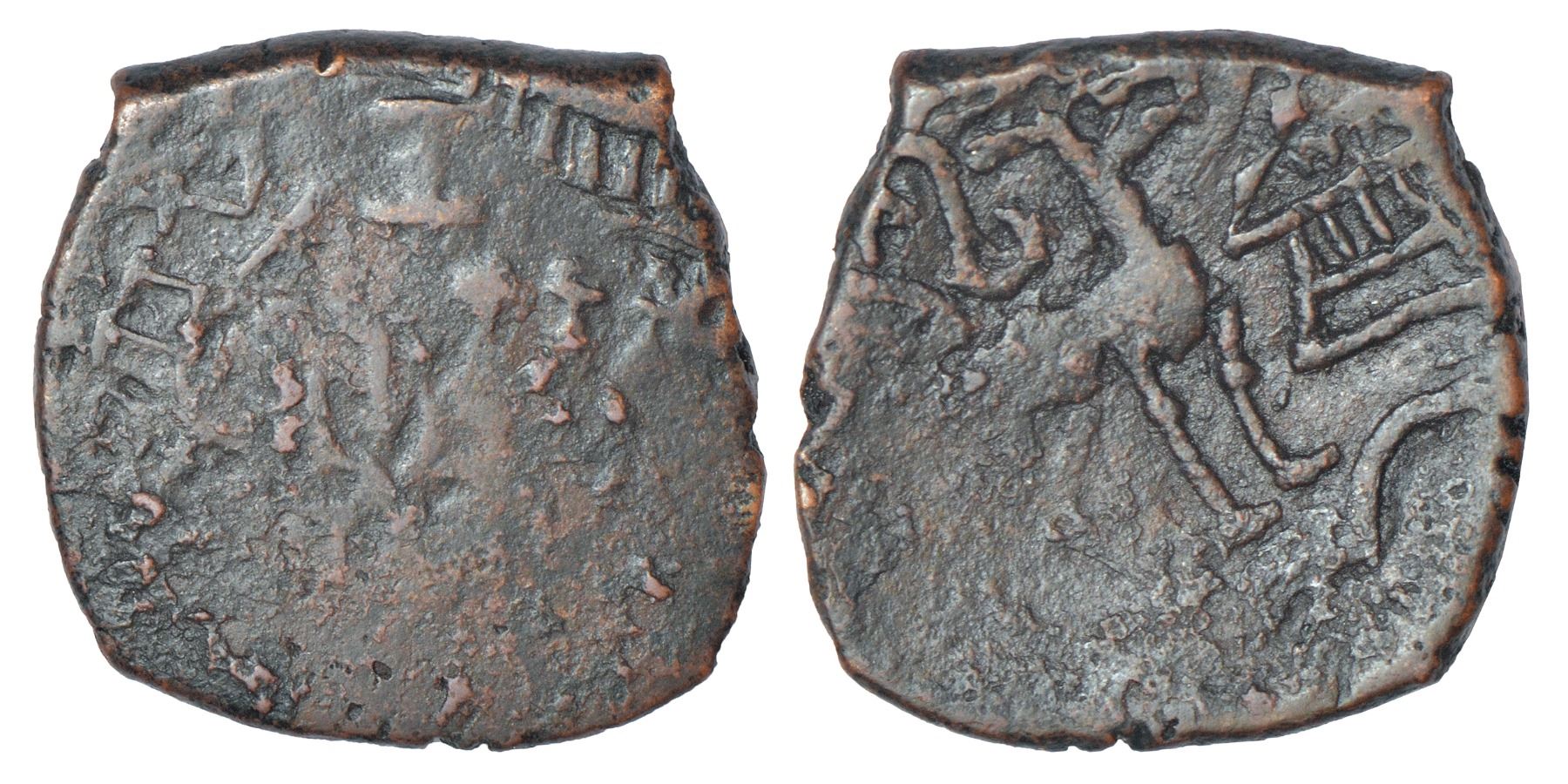 Post-Mauryan tribal republics - Yaudheyas, square copper coin struck in the name of 'Brahmanya Deva' as tutelary deity of the clan (c.50 BC-50 AD), PAIC 1639., 6.33g. Obv: Six-headed Karttikeya standing facing holding a javelin, with hand on hip, partly visible; traces of Brahmi legend to left. Rev: Deer facing right, Shrivatsa above and a temple to right.