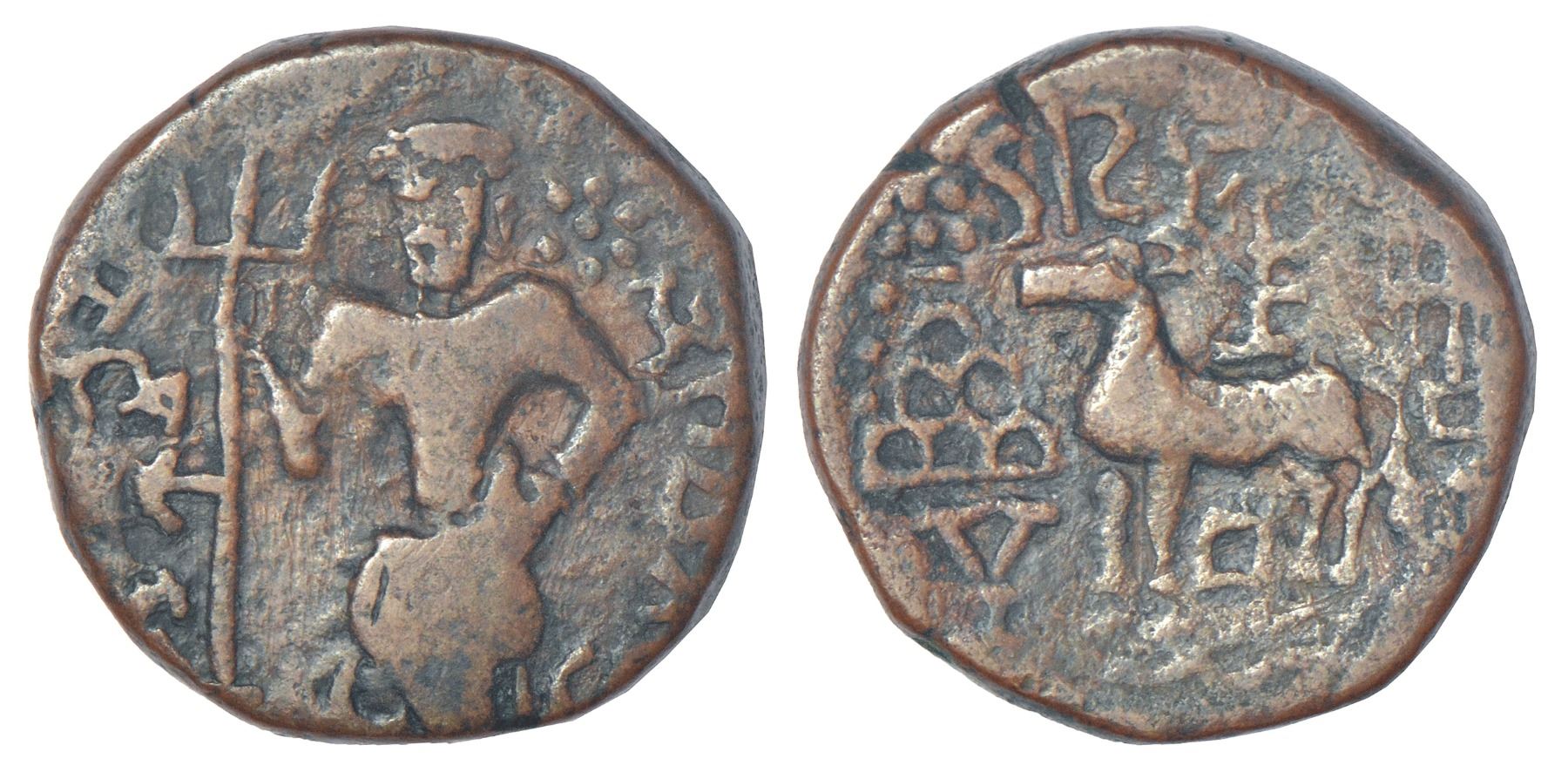 Post-Mauryan tribal republics - Yaudheyas or Kunindas, copper coin struck in the name of 'Chitreshwara' as tutelary deity of the clan (c.50 BC-50 AD), PAIC 1646, 16.79g. Obv: Shiva standing frontally holding trident-battle axe in one hand and the other hand on his hip; Brahmi legend Bhagavato…. to right and …tmanah to left. Rev: Deer facing left, altar between its legs, a 'key'-like symbol, Shrivatsa and a vase above, six-arched hill topped by a sun and a triangle-headed standard to left, traces of tree-in-railing to right and a wavy line below.