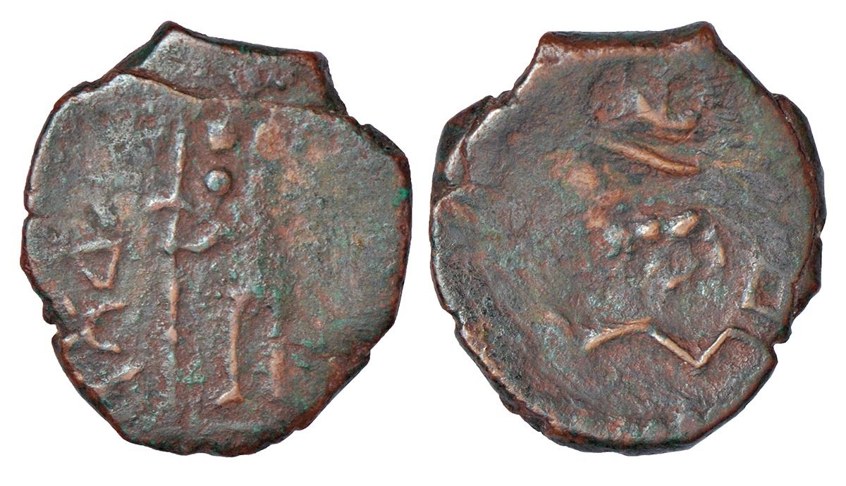 Ancient India: Post-Mauryan tribal republics, Yaudheyas - copper coin struck in the name of 'Brahmanya Deva' as tutelary deity of the clan (c.50BC-50AD), similar to PAIC 1630/31, 6.10g. Obv: single-headed Karttikeya standing facing holding a javelin, with hand on hip; Brahmi legend Bhagavato… to left. Rev: deer facing right, traces of temple to right; Shrivatsa above and a wavy line below.