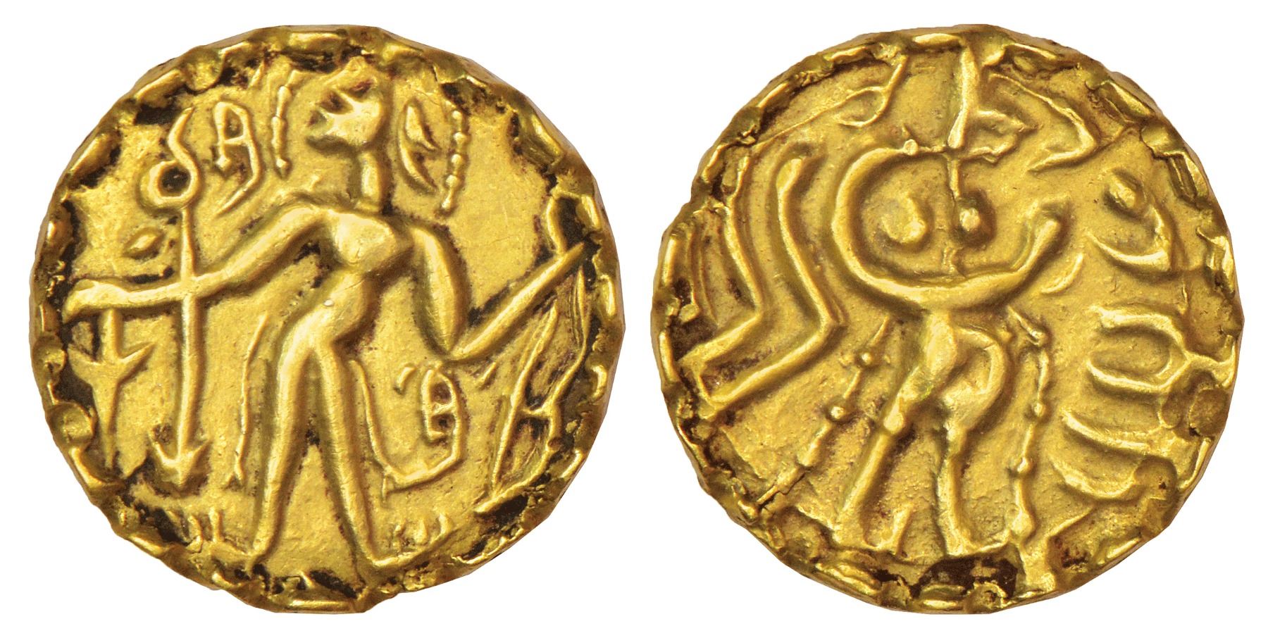 Pre-Islamic Bengal-Samatata region, gold dinar of Sridharana Rata of Rata dynasty (c.664-675 AD), ECB SAM15.1, 4.69g. Obv: Stylized representation of a nimbate 'archer' type king, holding bow in one hand and arrow in the other, with a crudely executed 'Shankha' standard in the backdrop and Brahmi letter Shri to the left of the head; Brahmi letter Shri below the hand with bow. Rev: Stylized representation of goddess, facing right, making a gesture of reassurance, with curved lines (drapery?) behind her back; crude inscription to right.