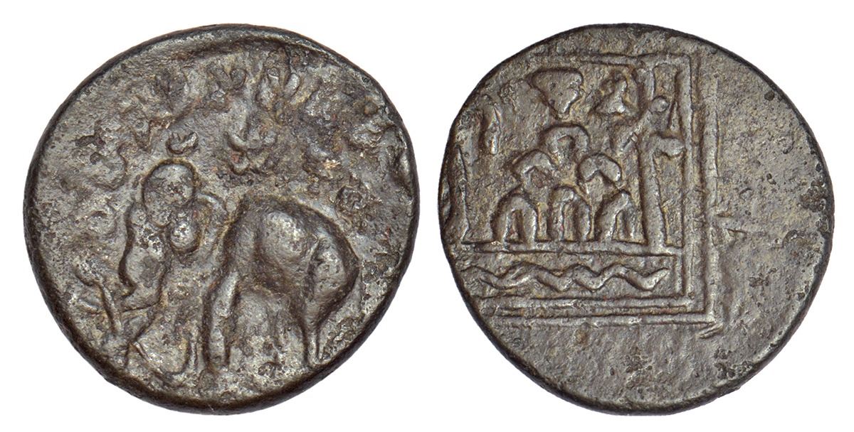 Ancient India: Rayalaseema, Upper Krishna Valley in Coastal Andhra Pradesh - alloyed copper coin of Maharathi Siva Mahahathi (c.200-250 AD), 4.62g. Obv: elephant standing facing left, small Shrivatsa symbol above its neck; Brahmi legend Maharathisa Siva Maha… above. Rev: six-arched hill topped with a small triangle-headed standard, with wavy line below, flanked by a palm-tree to right and a sacrificial post (yupa) to left; all enclosed in a rectangular border.