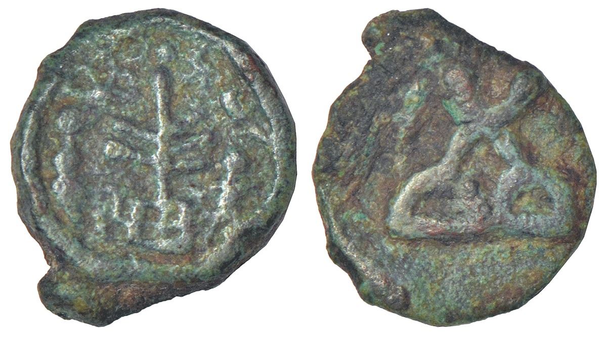 Taxila - uninscribed copper cast local coinage of post-Mauryan period, (c.200-150 BC), biface series, 'hill with human figures' type, PAIC 1541, 1.73g. Obv: A tree-in-railing flanked by two human figures who appear to worship the tree; small taurines towards the treetop. Rev: Three-arched hill surmounted by a crescent.