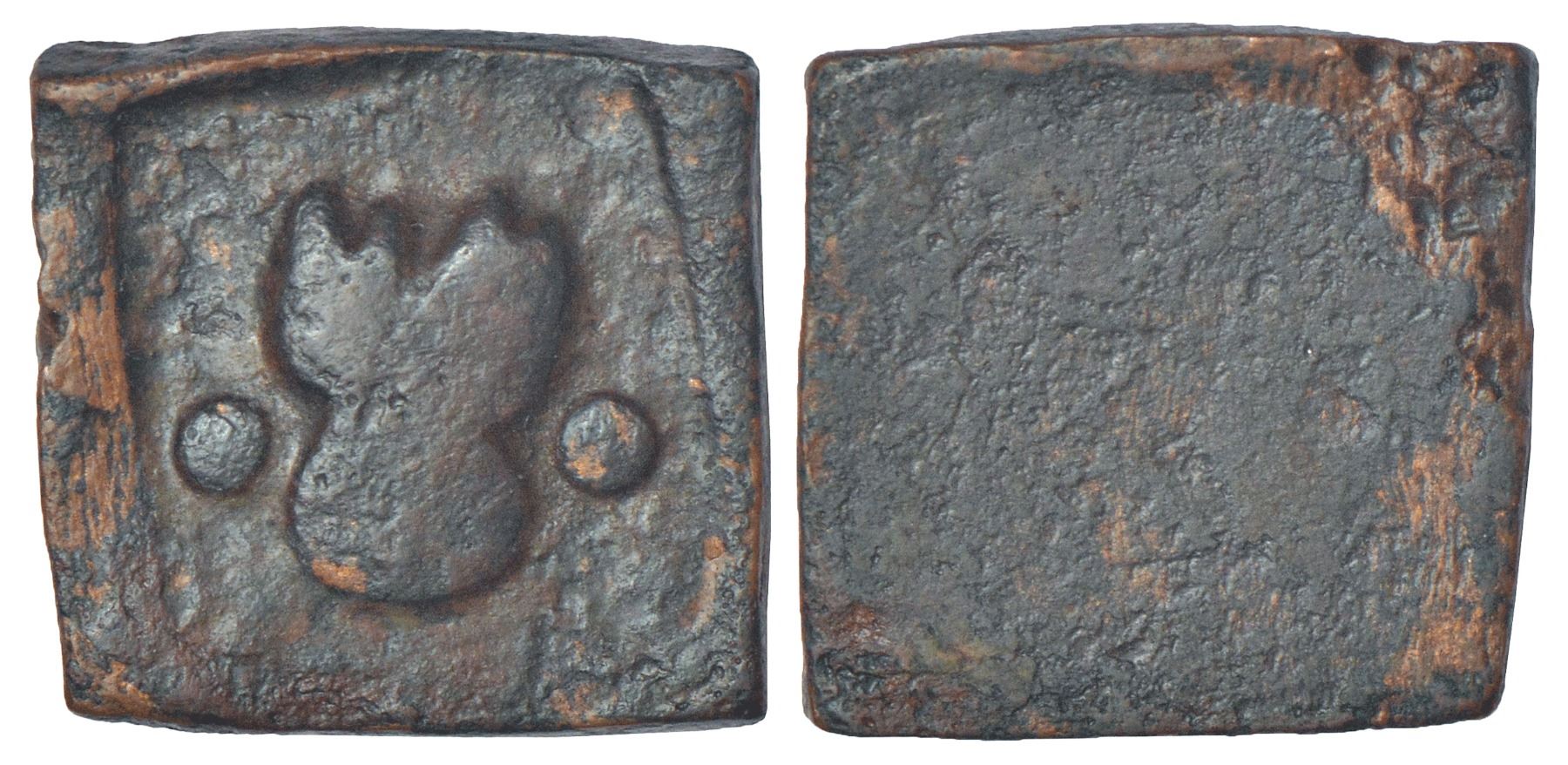 Taxila - uninscribed copper die-struck local coinage of post-Mauryan period, (c.200-150 BC), uniface series, 'Nandipada’ type, PAIC 1462, 5.79g. Obv: Nandipada flanked by two dots. Rev: Plain.