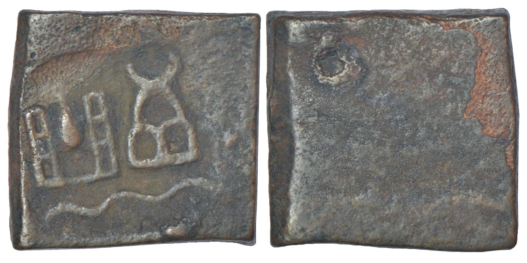 Taxila - uninscribed copper die-struck local coinage of post-Mauryan period, (c.200-150 BC), uniface series, 'symbolic’ type, PAIC 1430, 8.62g. Obv: A linga-shrine within railing and a three-arched hill above a wavy line. Rev: Plain.