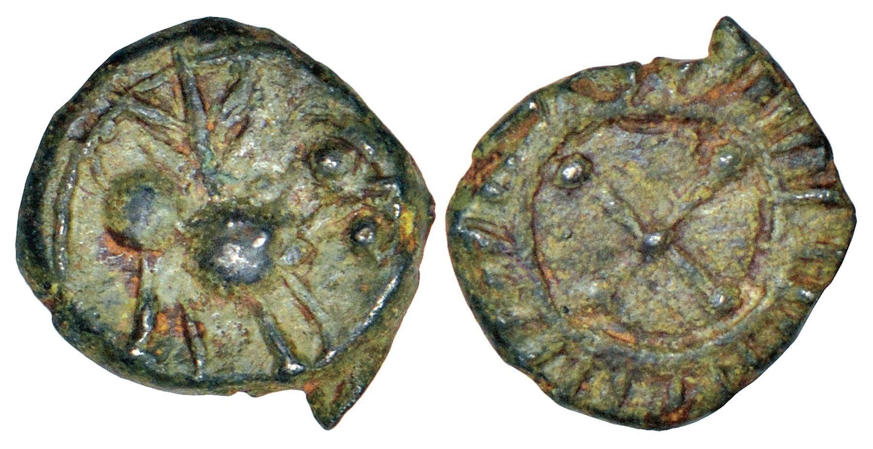 Vishnukundin, style coinage from Northern Maharashtra / Vidarbha, 'bull'-type coin in alloyed copper attributed to a local Rashtrakuta dynasty, (600-800 AD), 1.79g. Obv: Bull facing right in dotted circle, trident above. Rev: Four-spoked wheel within a rayed circle.
