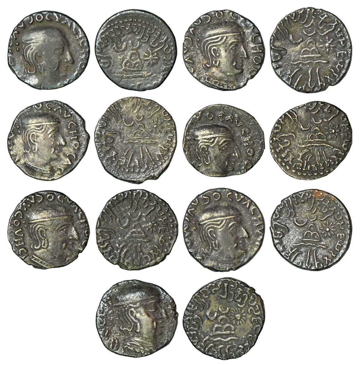 Western Kshatrapas (7), Kardamaka dynasty, silver drachm of Rudradaman as Mahakshatrapa (165-177 AD), Fishman 7.3b ('Mint B'), 1.97g, 2.19g, 2.27g, 2.28g - small die shadow on reverse, 2.29g, 2.33g, 2.35g. Obv: Profile bust of king facing right, illegible Greek legend around. Rev: Dynastic emblem in centre; Brahmi legend Rajño Kshatrapasa Jayadamaputrasa Rajño Mahakshatrapasa Rudradamasa. (7 coins)