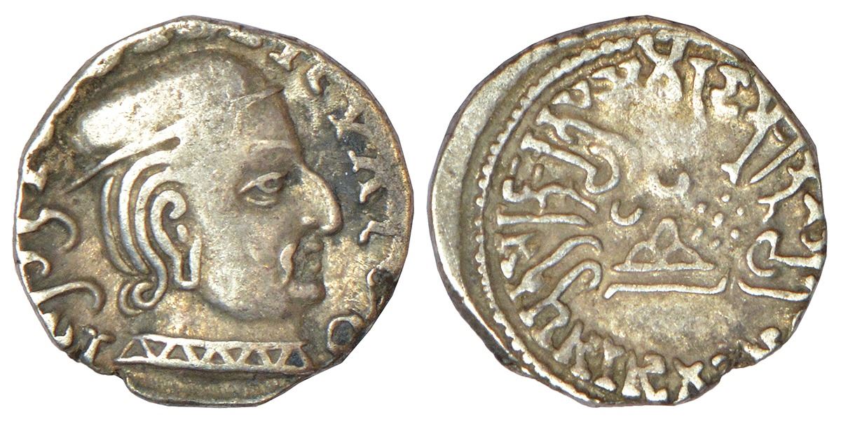 Western Kshatrapas, Kardamaka dynasty, silver drachm of Viradaman as Kshatrapa (c.234-238 AD), dated SE 158, Fishman 21.1.158, Mint A, 2.19g. Obv: Profile bust of king to right wearing flat cap and earrings, Greek legend around, date in Brahmi numerals behind bust. Rev: Three arch hill (chaitya) at center surmounted by a crescent and flanked by sun and moon, wavy line (river) below, Brahmi legend in Prakrit language from 2 o'clock Rajno Mahakshatrapasa Damasenasaputrasa Rajnah Kshatrapasa Viradamnah.