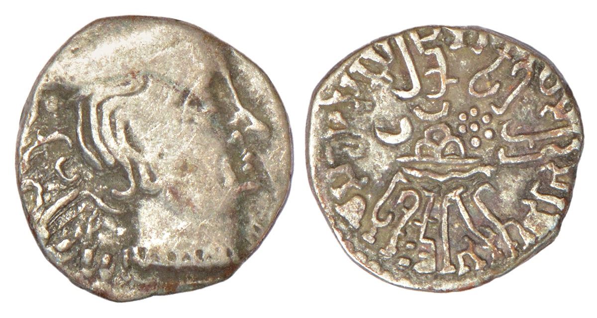 Ancient India: Western Kshatrapas, Karddamaka dynasty, silver drachm of Damasena s/o Rudrasimha I as Kshatrapa (SE 144/ 222 AD), dated SE 144 (fully visible), first year of ruler, Fishman 18.1.144, Mint A3, 2.00g. Obv: profile bust of king facing right, Greek legend around; date behind the head. Rev: dynastic emblem in centre, Brahmi legend Rajño Mahakshatrapasa Rudrasihasa putrasa Rajñah Kshatrapasa Damasenasa around.