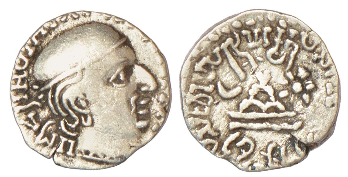 Ancient India: Western Kshatrapas, Karddamaka dynasty, silver drachm of Jivadaman I s/o Damajadashri as Mahakshatrapa (SE 119-121/ 197-199 AD), dated SE 119 (fully visible), Fishman 12.2.119, Mint B, 1.99g. Obv: profile bust of king facing right, Greek legend around; date behind the head. Rev: dynastic emblem in centre, Brahmi legend Rajño Mahakshatrapasa … kshatrapasa Jivadamasa around.