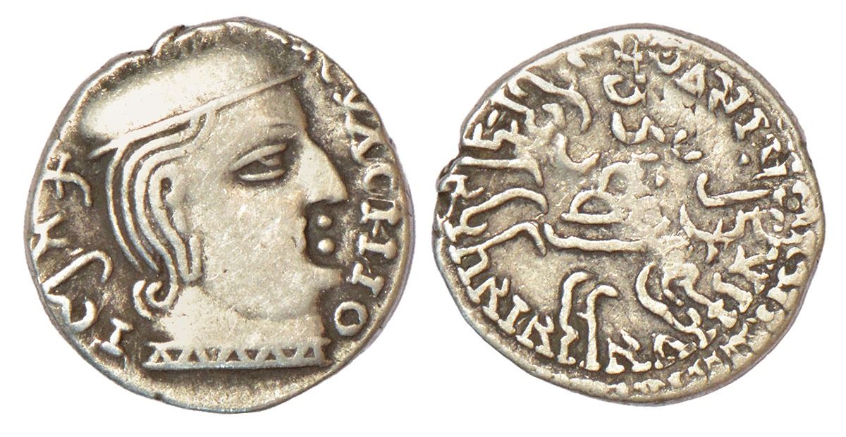 Ancient India: Western Kshatrapas, Karddamaka dynasty, silver drachm of Pruthivisena s/o Rudrasena I as Kshatrapa (SE 144/ 238 AD), dated SE 144, Fishman 17.1.144, Mint A, 2.32g. Obv: profile bust of king facing right, Greek legend around; date behind the head. Rev: dynastic emblem in centre, Brahmi legend Rajño Mahakshatrapasa Rudrasenasa putrasa Rajñah Kshatrapasa Pruthivisenasa around.