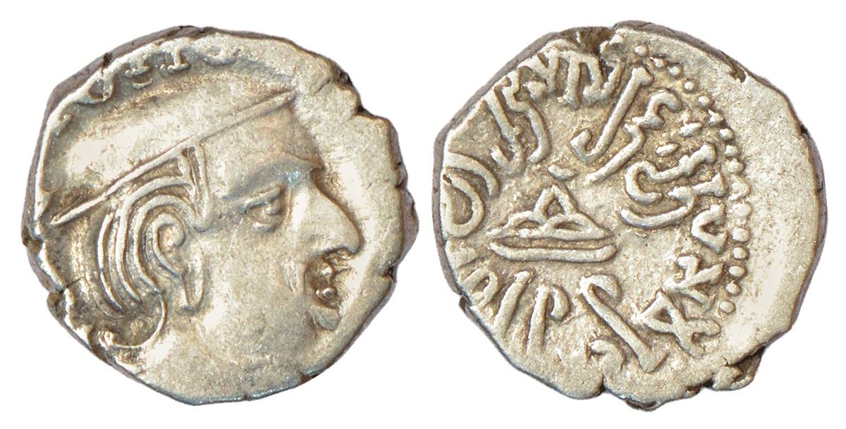 Ancient India: Western Kshatrapas, Karddamaka dynasty, silver drachm of Rudrasena II s/o Viradaman as Mahakshatrapa (SE 177-198/ 255-276 AD), without the symbols of sun and moon, not listed in Fishman, Mint B2, 2.22g. Obv: profile bust of king facing right, Greek legend around. Rev: dynastic emblem in centre, Brahmi legend Rajñah Kshatrapasa Viradamaputrasa … Rudrasenasa around.