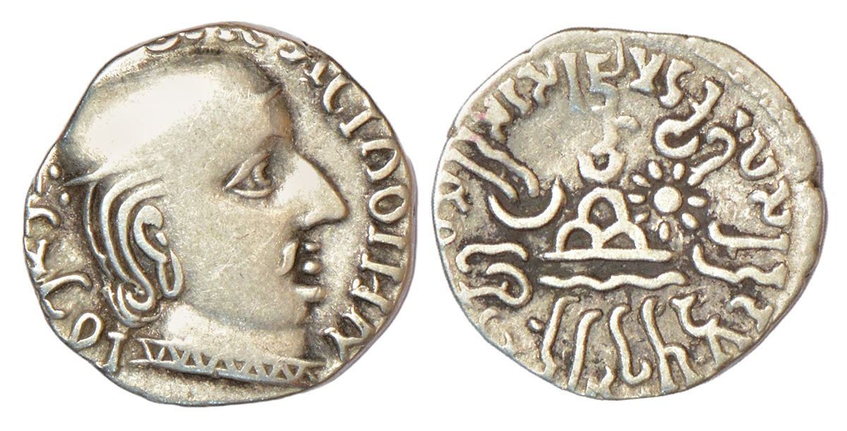 Ancient India: Western Kshatrapas, Karddamaka dynasty, silver drachm of Rudrasimha I s/o Rudradaman as Mahakshatrapa (SE 99/100-119/ 177/78-197 AD), dated SE 117 (fully visible), Fishman 11.2.117, Mint A, listed as 'extremely rare', 2.24g. Obv: profile bust of king facing right, Greek legend around; date behind the head. Rev: dynastic emblem in centre, Brahmi legend Rajño Mahakshatrapasa Rudradamnaputrasa Rajño Mahakshatrapasa Rudrasihasa around.