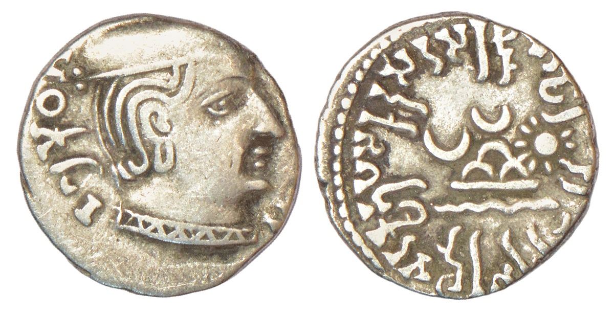 Ancient India: Western Kshatrapas, Karddamaka dynasty, silver drachm of Rudrasimha I s/o Rudradaman as Mahakshatrapa (SE 99/100-119/ 177/78-197 AD), dated SE 104 (fully visible), Fishman 11.6.104, Mint B, listed as 'not reported, may exist', 1.98g. Obv: profile bust of king facing right, Greek legend around; date behind the head. Rev: dynastic emblem in centre, Brahmi legend Rajño Mahakshatrapasa Rudradamaputrasa Rajño Mahakshatrapasa Rudrasihasa around.