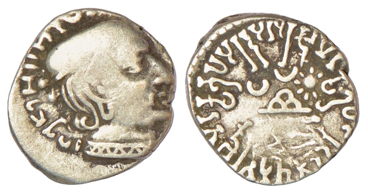Ancient India: Western Kshatrapas, Karddamaka dynasty, silver drachm of Rudrasimha I s/o Rudradaman as Mahakshatrapa (SE 99/100-119/ 177/78-197 AD), dated SE 117 (fully visible), Fishman 11.6.117, Mint B, listed as 'extremely rare', 2.12g. Obv: profile bust of king facing right, illegible Greek legend around; date behind the head. Rev: dynastic emblem in centre, Brahmi legend Rajño Mahakshatrapasa Rudradamaputrasa Rajño Mahakshatrapasa Rudrasihasa around.