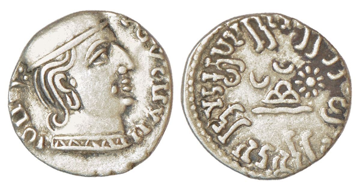 Ancient India: Western Kshatrapas, Karddamaka dynasty, silver drachm of Rudrasimha I s/o Rudradaman as Mahakshatrapa (SE 99/100-119/ 177/78-197 AD), Fishman 11.5, Mint B, Undated type and listed as extremely rare, 2.17g. Obv: Profile bust of king to right wearing flat cap and earrings, Greek legend around. Rev: Three arch hill (chaitya) at center surmounted by a crescent and flanked by sun and moon, wavy line (river) below, Brahmi legend in Prakrit language from 8 o'clock Rajno Mahakshatrapasa Rudradamaputrasa Rajno Mahakshatrapasa Rudrasihasa around.