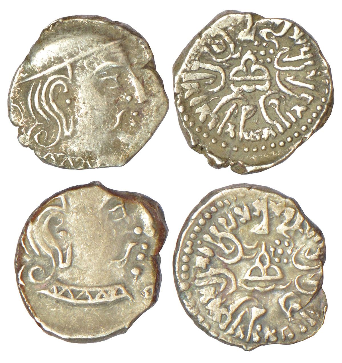 Ancient India: Western Kshatrapas, Karddamaka dynasty, two silver drachms of Swami Rudrasimha III (c.385-415 AD), date off flan, Fishman 38.2.X, 2.14g and 2.10g respectively. Obv: Profile bust of king facing right. Rev: Three arch hills (chaitya) at center surmounted by a crescent and flanked by sun and moon, wavy line (river) below, Brahmi legend in Prakrit language Rajño Mahakshatrapasa Swami Satyasenaputrasa Rajño Mahakshatrapasa Swami Rudrasihasa. (2 coins)