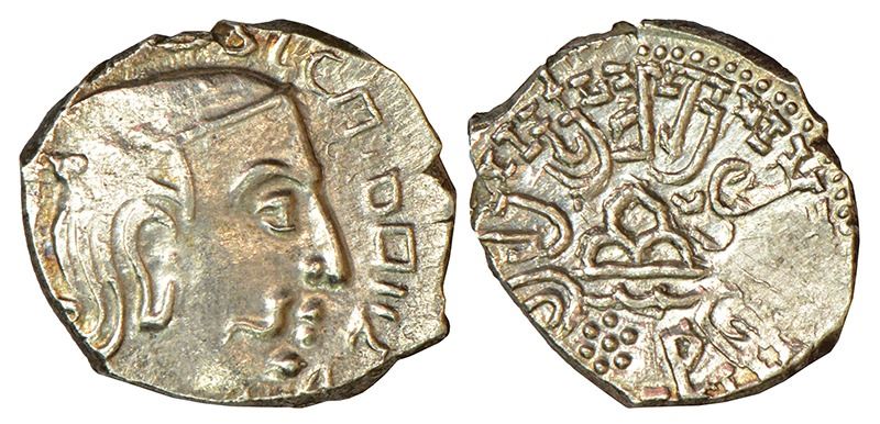 Western Kshatrapas, house of Jivadaman II, silver Drachm of Rudrasena IV (380-385 AD?), Fishman 36.3, 2.07g. Obv: Bust of king facing right wearing flat cap, illegible 'Greek' legend around . Rev: Dynastic emblem in the centre; Brahmi legend beginning at 3 o'clock Maharaja Kshatrapa …Rajño Mahakhsatrapa Swami Rudrasenasa.